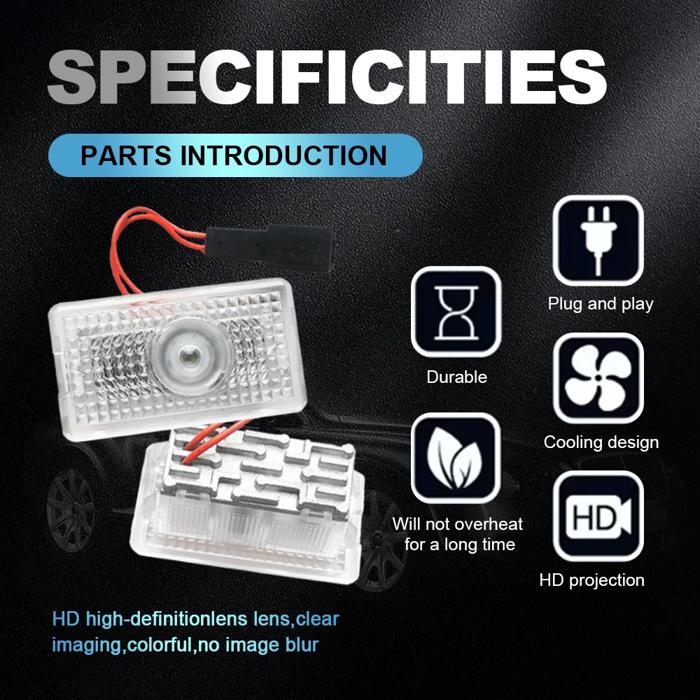 • 5.0 Glass Version, also known as Adjustable Car Door Logo Lights, features an adjustable lens and does not project a logo with blue edges. These door lights successfully break the limits of traditional car door logo lights by providing users with the flexibility to easily adjust the placement of the projected logo pattern.